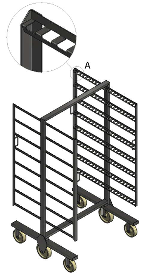 - Mobility: Equipped with 6 heavy-duty Nylon “HT” wheels – 4 external Ø175 mm and 2 central Ø200 mm, heat-resistant up to 80°C